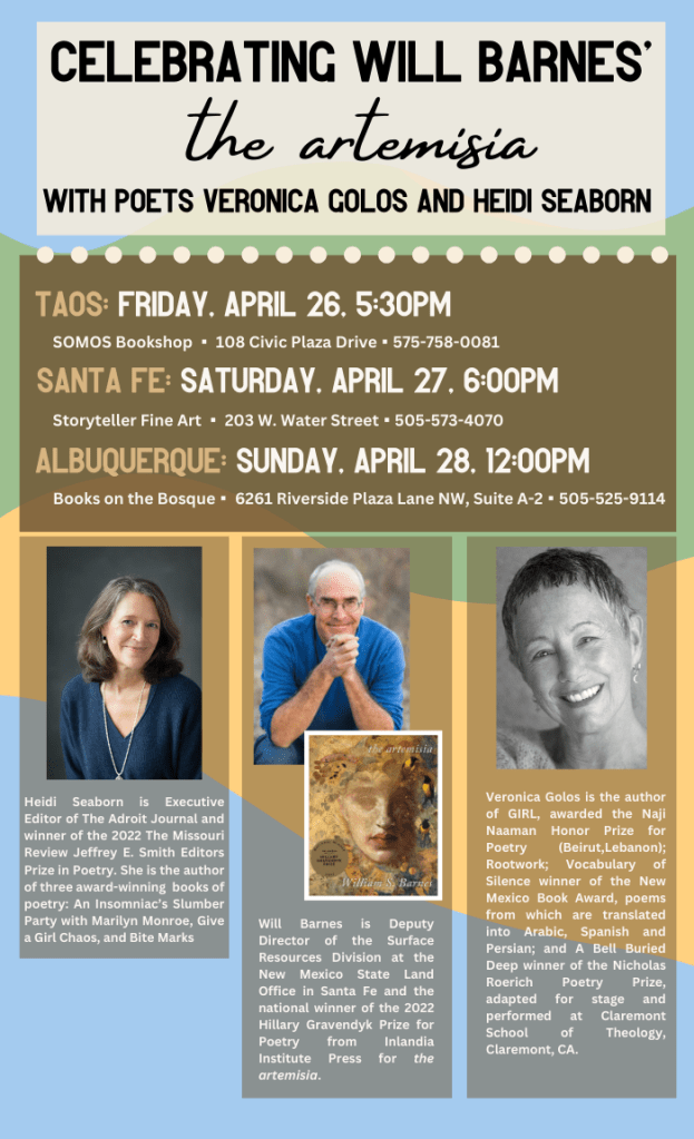 - April 26, 2024: SOMOS, 108 Civic Plaza Drive, Taos, NM 5:30 pm with Veronica Golos and Heidi Seaborn